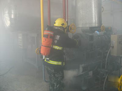 當氨制冷系統(tǒng)發(fā)生漏氨事故時,相關人員切不可慌不擇路的選擇自我逃生。當班操作人員要沉著鎮(zhèn)靜,以免亂開或錯開機器設備上的閥門,導致事故進一步擴大。迅速報警,撤離疏散污染區(qū)人員至上風處,并立即隔離150M,嚴格限制閑雜人員出入。必須正確判斷情況,組織有經(jīng)驗的技工進入現(xiàn)場搶救。處理人員必須佩戴正壓式呼吸器,穿防毒服。戴好防護人員進入現(xiàn)場,在水壓防護下處理泄漏點。關閉閥門或加密封等。在整個氨制冷系統(tǒng)中及時發(fā)現(xiàn)漏氨部位,做到早發(fā)現(xiàn),早處理。如是高壓管道泄漏,應立即停止壓縮機運行,切斷漏氨部位與系統(tǒng)連通的管道。若管道不長,可采用放空的辦法,待管內(nèi)余氨放完,并置換后進行補焊。如低壓管道(如冷庫內(nèi)冷卻設備)漏氨,應迅速查明漏點,關閉其供液閥。由于庫房氨汽甚濃,可開風機排除,并用酸酸溶液噴霧中和。若條件允許,可啟動壓縮機將該冷卻設備內(nèi)氨液抽回。操作人員可根據(jù)制冷系統(tǒng)不同特點和具體情況,采取靈活、安全、有效的處理方法。